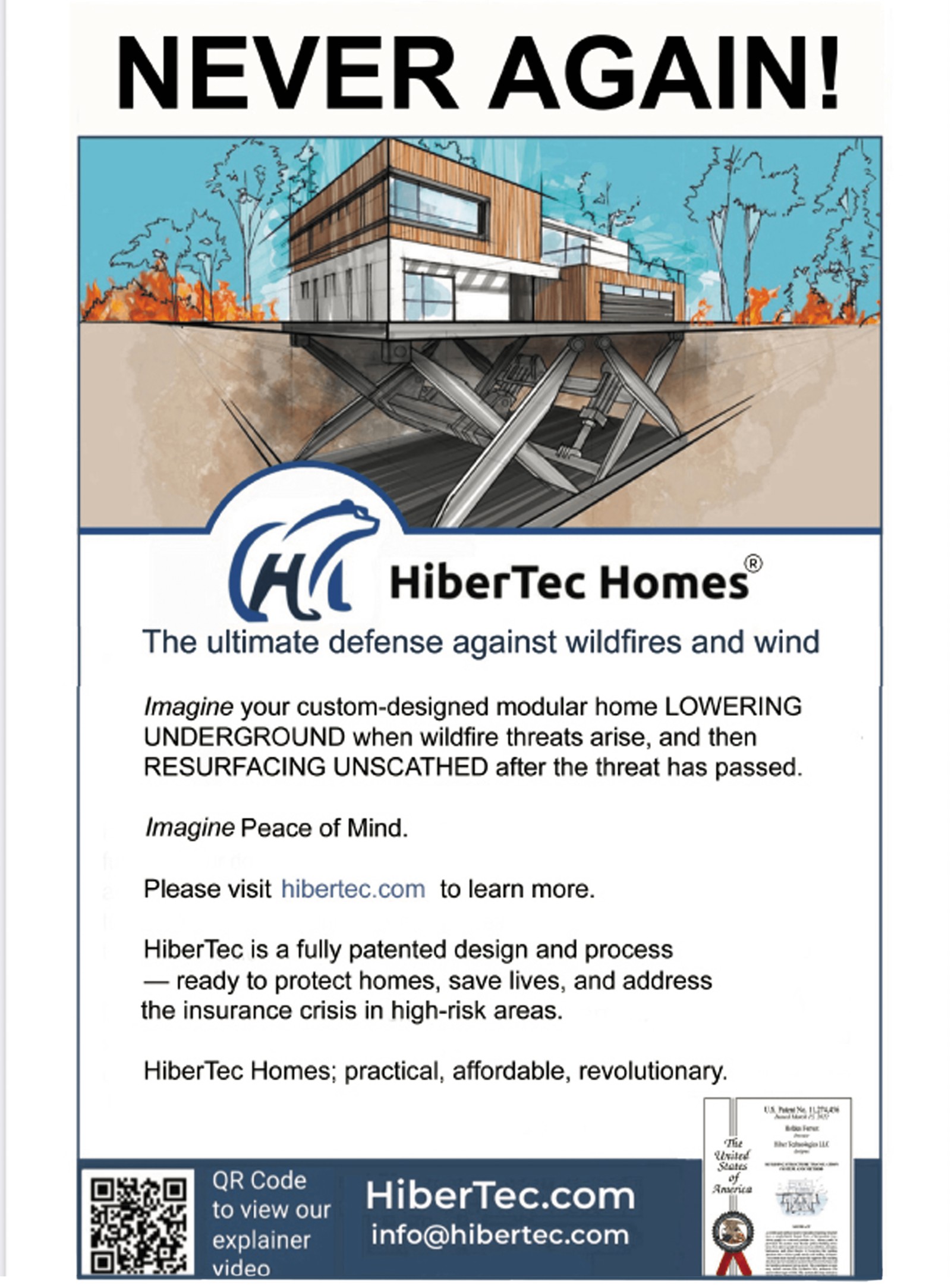 HiberTec Homes is a cutting-edge, fully patented design and process where custom designed modular homes automatically lower underground when wildfire threats arise - to then resurface unscathed to ground level after the threat has passed. Six years of extraordinary engineering and architectural collaboration have produced multiple, patented safety breakthroughs.
